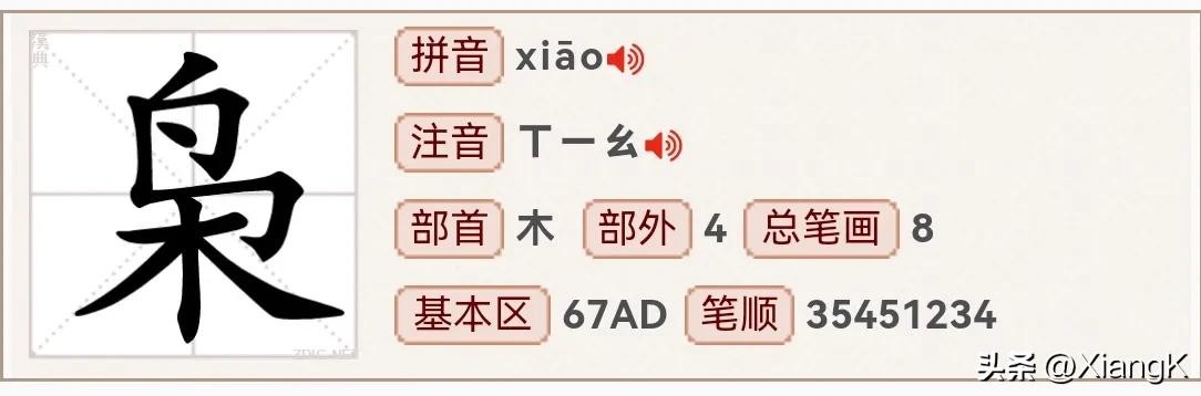 读音为“xiāo”,同音字“肖”,部首为“木”,总笔画8,上下结构。