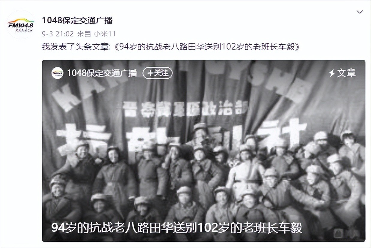 据保定交通广播官方9月3日发文透露,94岁的抗战老八路演员田华来到北京八宝山,坐着轮椅送别102岁的老班长车毅。田华奶奶虽然年纪大了,但拒绝亲人搀扶,坚持站起来向老班长行军礼送别。