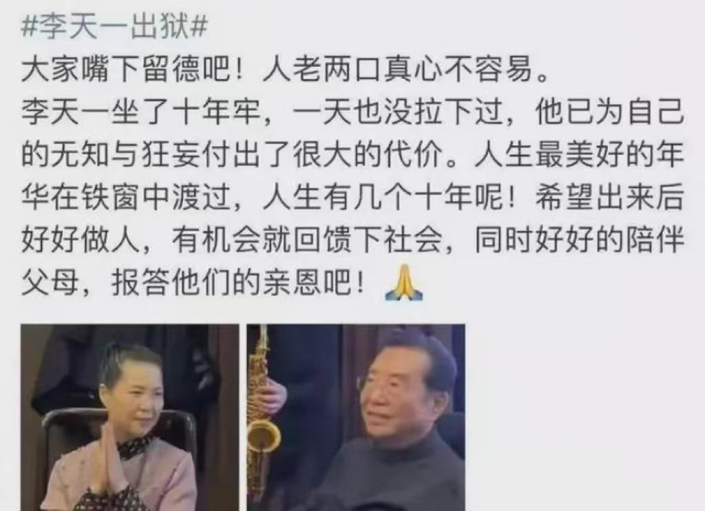 李天一(现李冠丰)在今年2月的就刑满释放了,
