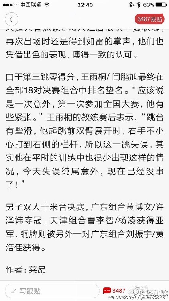 不过,从黄博文的配图球迷终于知道黄博文原来是在调侃自己。黄博文社交媒体的配图是来自网易新闻客户端的一张截图。这张截图的内容是关于在广西南宁举行的全国跳水冠军赛暨奥运会选拔赛女子10米台决赛。