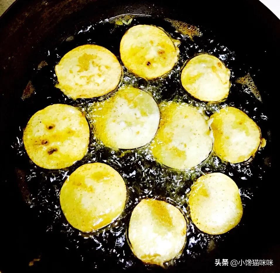7. 锅放油,烧热, 茄盒放入油锅,中小火,将其炸至两面金黄即可。
