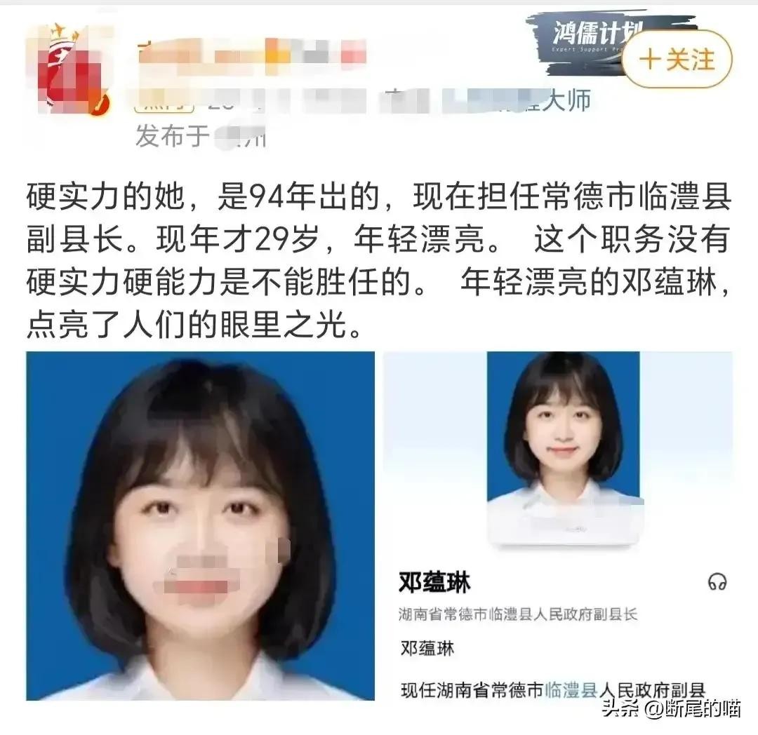 一、公开资料显示这位漂亮的姑娘叫邓蕴林,被保送上得北大,毕业后通过公考考入湖南省科技厅,工作两年后下派到湖南省常德市临澧县当副县长。她的简历就像一张白纸,干净利索,能描绘更好更美的图画,邓蕴林在职期间受到上下级官员的称赞,看来工作能力是蛮强的。昨天湖南《常德日报》辟谣,媒体报道的邓蕴林,1994年出生,保送上北大等消息不实,她是1986年出生,湖南理工学院本科毕业,后来上中南财经大学硕士研究生,最后公考入湖南省科技厅,原来女主比网上爆料的大了8岁,而且2022年8月已经挂职锻炼结束,又回到原单位。