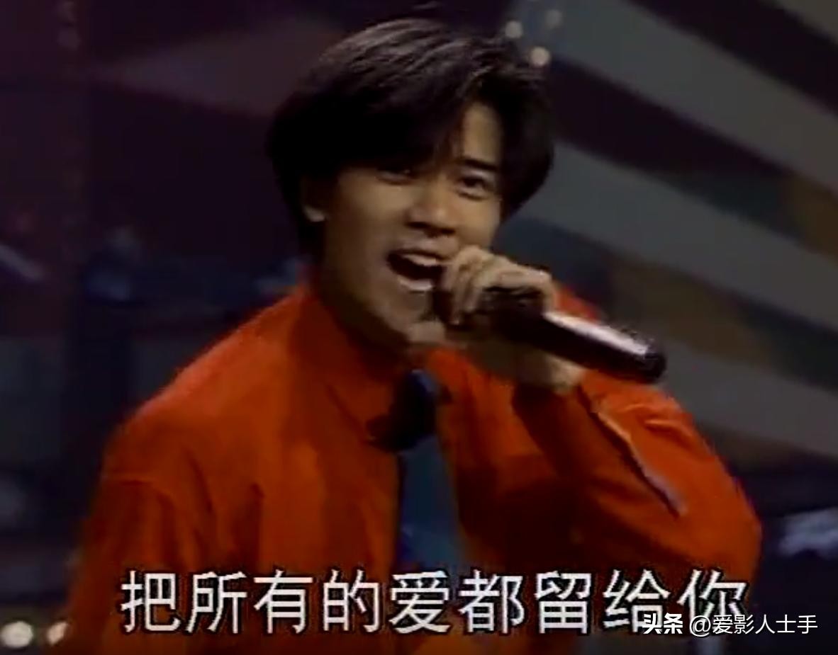 郭富城留着蘑菇头,梳着三七分,唱着《把所有的爱都给你》,观众的情绪瞬间被点燃。