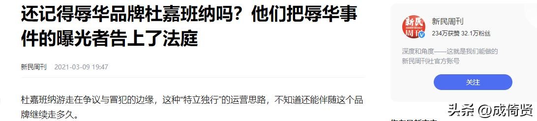 1.新民周刊:2021年3月9日,还记得辱华品牌杜嘉班纳吗?他们把辱华事件的曝光者告上了法庭