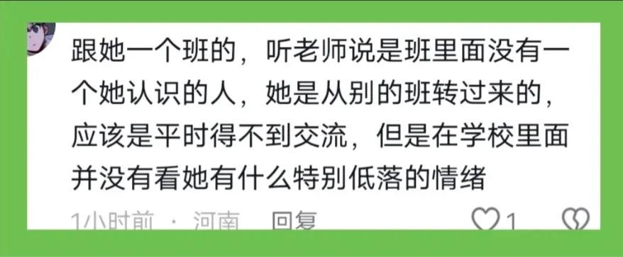 还有家长说,这个女孩是他儿子七年级的同学,学习成绩挺好的。她的一个班上同学在网上留言说,老师提过,班里没她熟悉的人,因为她是中途从别的班转过来的。