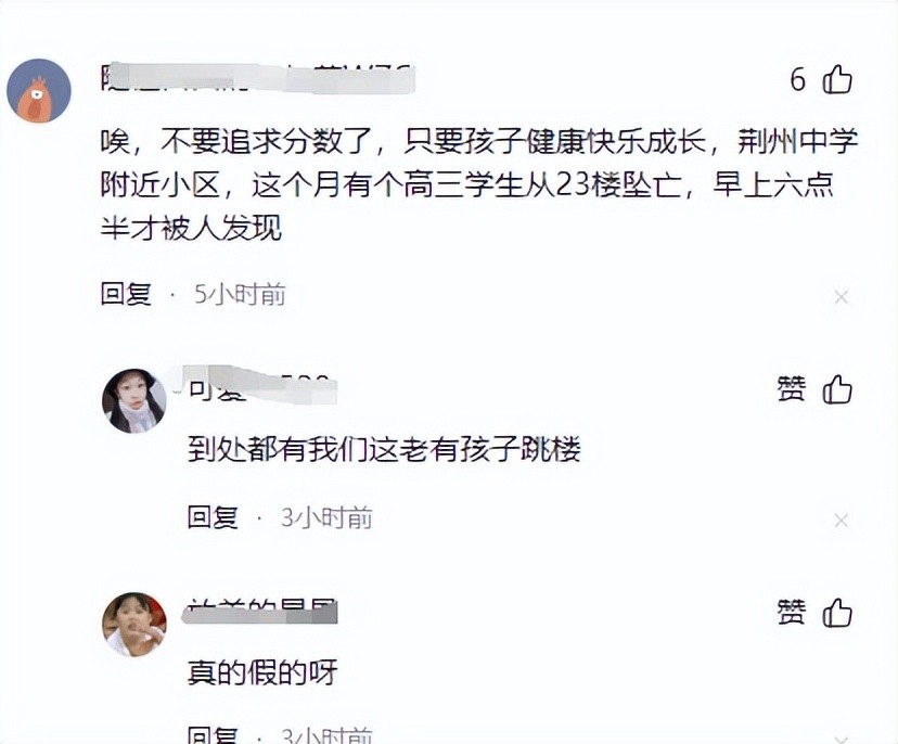 还有网友们是否因为学习压力:真的,别光看分数了,孩子健康快乐最重要。荆州中学附近的一个小区,这个月有个高三的学生从23楼摔下来,早上六点半才被人发现。这事儿太惨了。