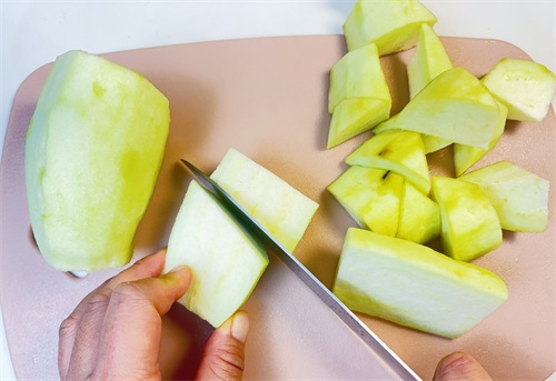 将削皮的紫茄子,洗干净,滚刀切成小块,备用。