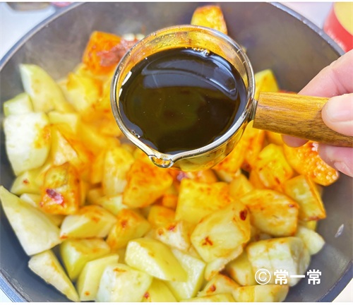 在锅中加入一勺老抽、一勺生抽,加入的量根据土豆和茄子的份量去加,希望浅口的生抽和老抽比例1:0.5,希望重口的1:1。