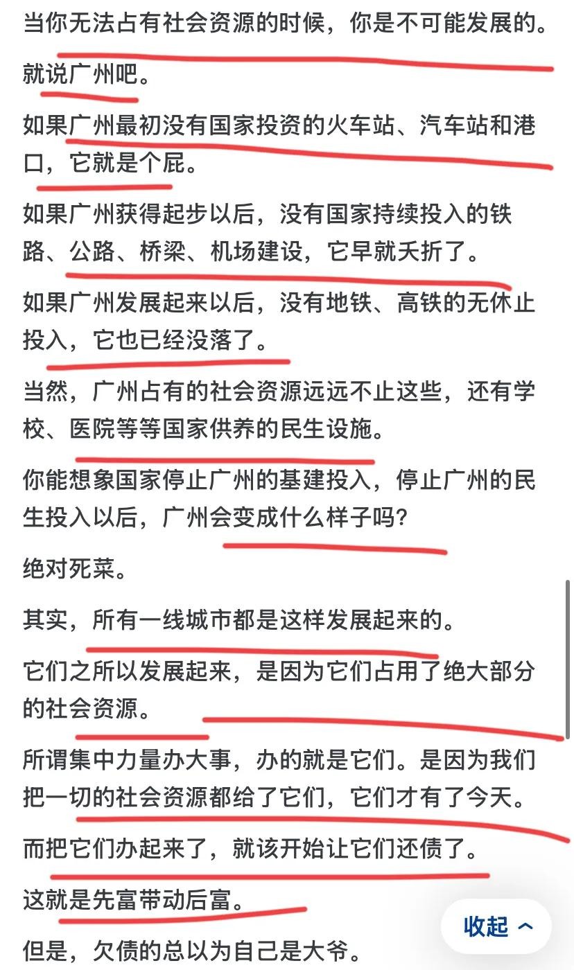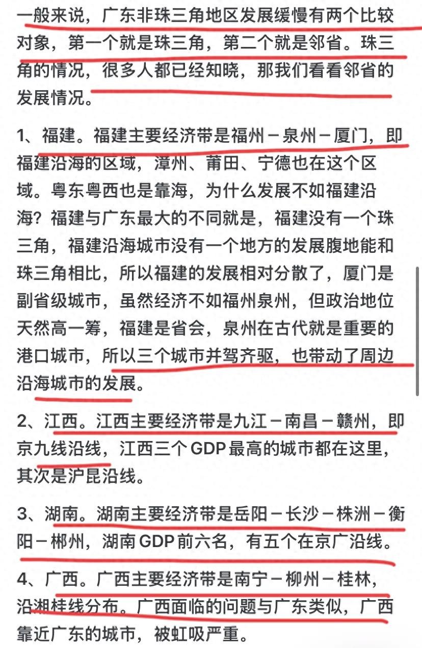 其实是开始发展深圳的时候固投都给深圳了,然后深圳发展起来给省里的钱又少,广州虽然上缴得多,但是大部分钱都流向外省。 结果珠三角宁愿每年补贴几百亿给粤东西北地区维持财也不愿意多点固投给非珠,一年粤东几百亿粤西几百亿粤北几百亿投进去,维持非珠半死不活的样子最好,这样子就可以一直虹吸人才和青壮劳动力。