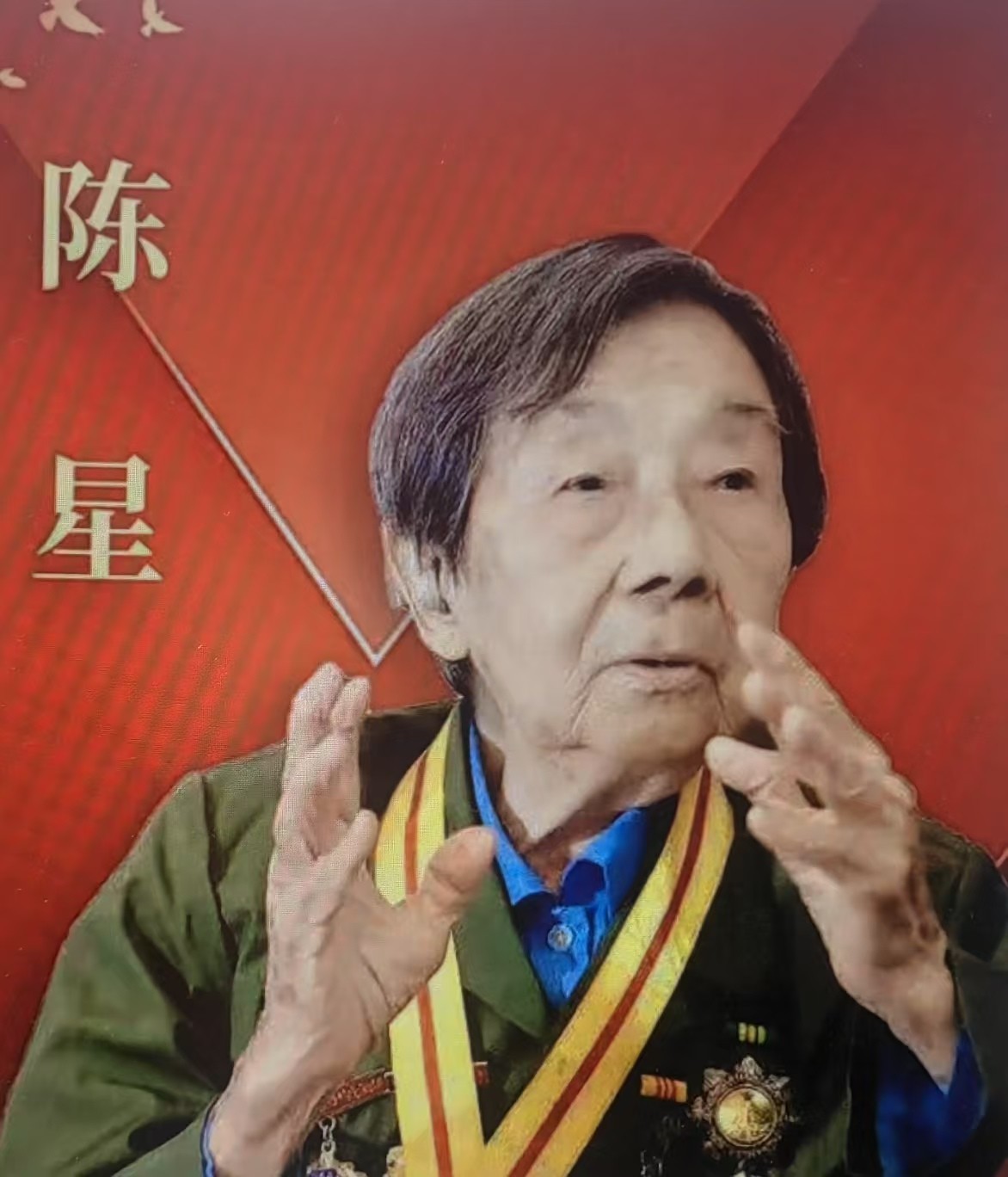 陈星,1938年3月在安徽参加新四军,1939年4月加入中国共产党,投身于如火如荼的抗日战争,曾荣获三级独立自由勋章、三级解放勋章。1982年在安徽省对外贸易局驻广州办事处离休。90岁之前,她一直担任广州市4所小学的校外辅导员,把党的光荣传统和优良作风传给孩子们。