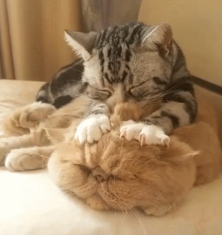 常见于猫咪与熟悉的同伴接触时,感到舒适、满足的情况。