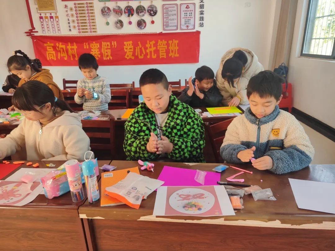 (长港镇高沟村寒假“爱心托管班”的孩子们学习制作手工画)