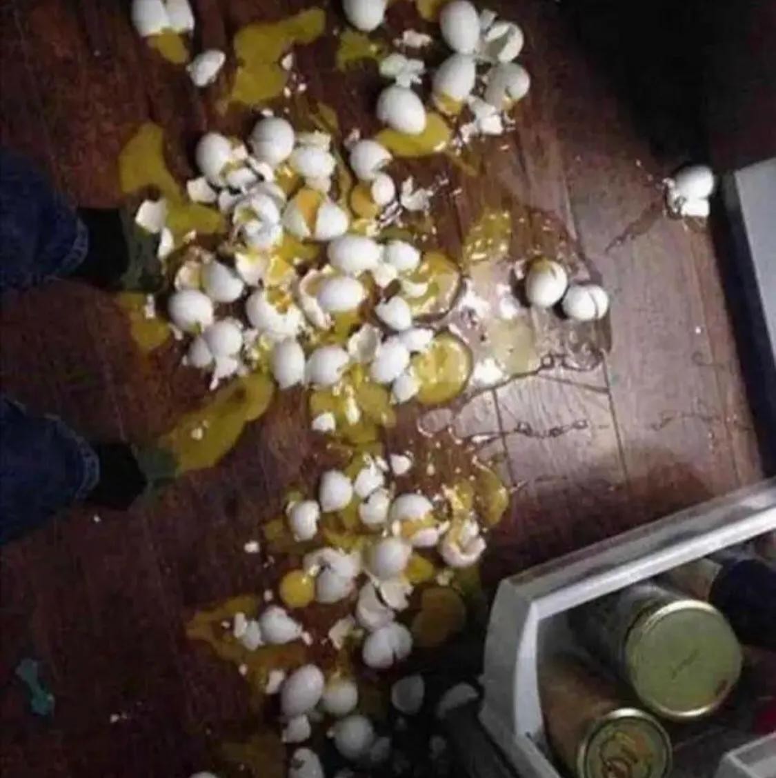 3. 冰箱里的鸡蛋不小心洒了一地,真是出乎意料。