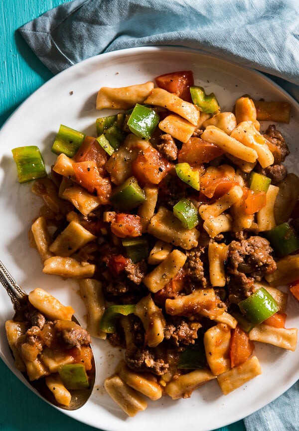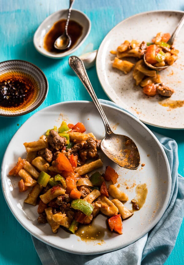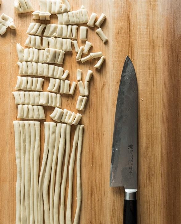 如果你自己做面条,不要把面条拉成长长的细条,而是要让面条变厚,然后切成小块。这样会有更坚实的形状和更耐嚼的质地。而且这样面条会更好地吸收酱汁,更适合后续的炒制。