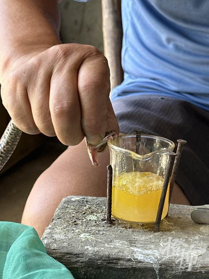 65岁的钱大叔有40多年的取蛇毒经验。去子思桥那天赶得巧,正好观摩了他取蛇毒的全过程。