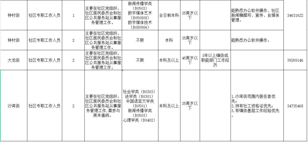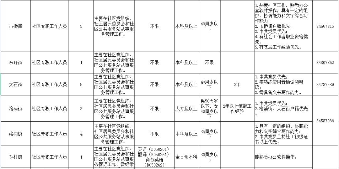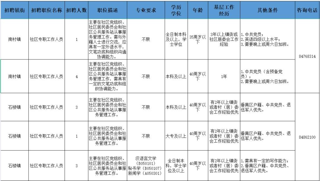 市桥街道办事处等9个单位共15个职位,具体岗位详见《番禺区2021年度公开招聘社区专职工作人员岗位表》(详见下表)。