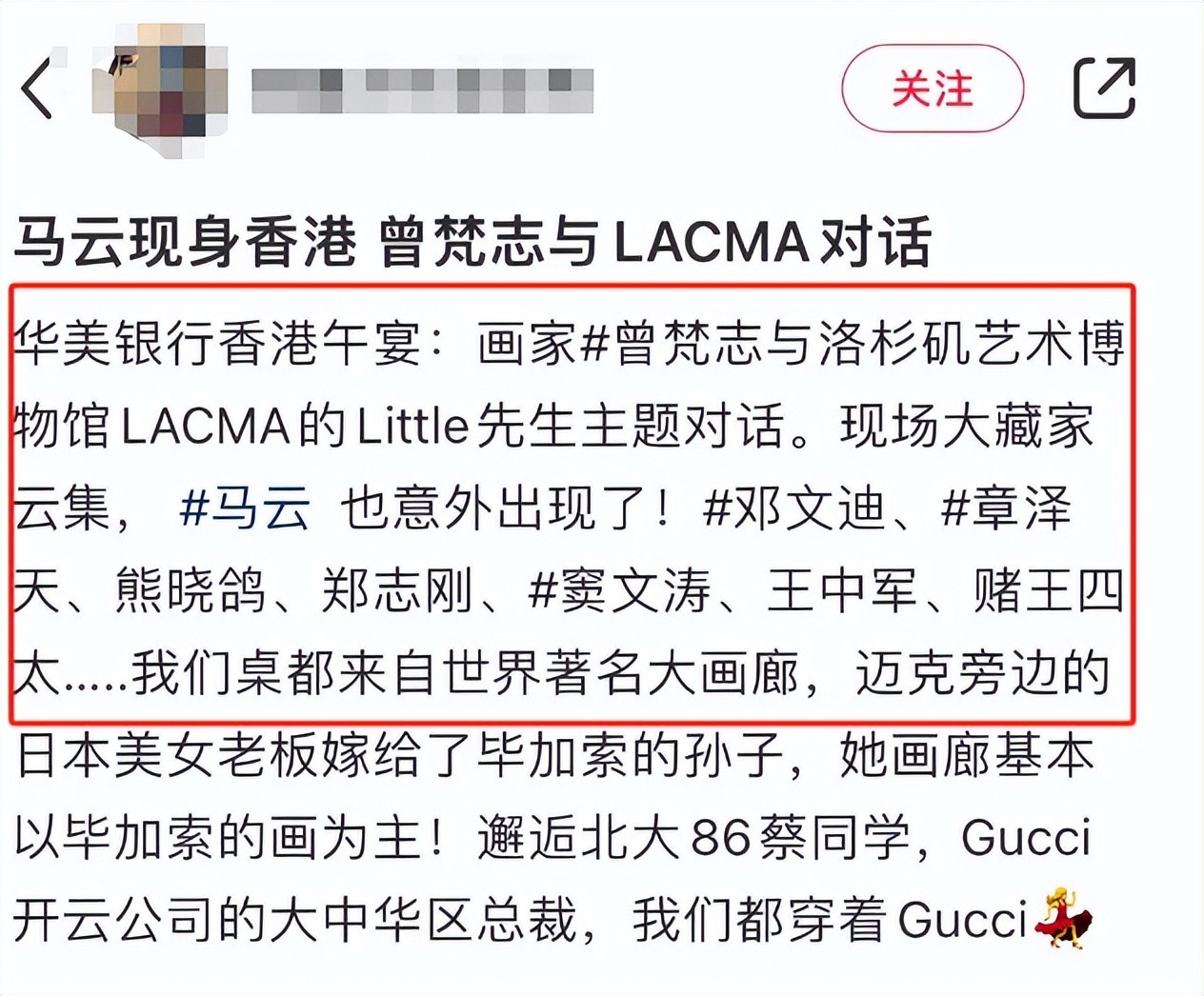 曾梵志在午宴上与其他名人合影时,他基本上都是站在C位,可轮到他和马云交谈的时候,非常自觉地将C位让了出来,由此可见马云的地位究竟有多高,只要是他出现的地方C位就无人敢争。