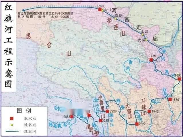 “红旗河”调水工程是一项将我国西南的珍贵水资源全程自流调往西北地区的大型工程,包括一条干线和三条主要支线:“红延河”、“漠北河”和“春风河”。“红旗河”干线从雅鲁藏布江开始取水,经过易贡藏布、帕隆藏布到达怒江,过澜沧江、金沙江到达雅砻江、大渡河、岷江、白龙江,继续北上穿过秦岭开始进入受水区,跨过渭河、黄河以后,沿河西走廊向西进入新疆,沿阿尔金山、昆仑山的山前平原向西延伸至和田、喀什。其中,过渭河以后,“红延河”支线穿过六盘山到达黄河以南的宁夏、内蒙古和陕北地区,最终进入延安;“漠北河”支线于龙首山下、阿拉善右旗境内开始,经狼山、阴山北坡,向内蒙古、北京方向延伸,最终进入密云水库,未来可到达辽西地区;“春风河”支线从河西走廊西部的玉门市附近开始,沿北山西侧延伸至新疆的吐鲁番、哈密盆地,主干线(雅鲁藏布江--新疆喀什)全长6188公里,建成后预计年调水量可以达到600亿立方米,预计总投资额高达40000亿元。简单来说,就是把西藏丰富的水资源输送到新疆等干旱地区,从而把新疆等地的干燥环境改造成湿润宜居的肥沃土地,从而再造一个江南。