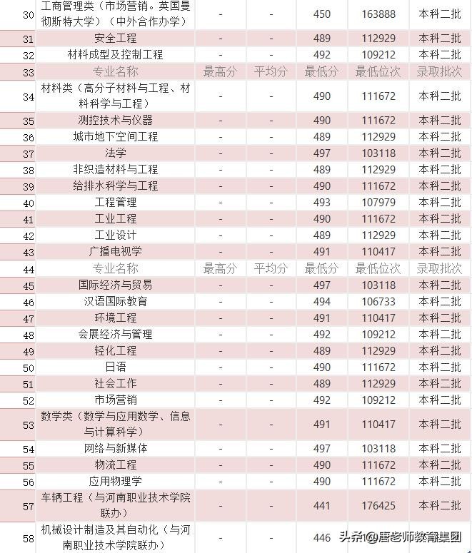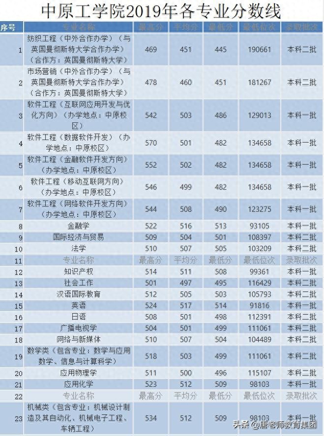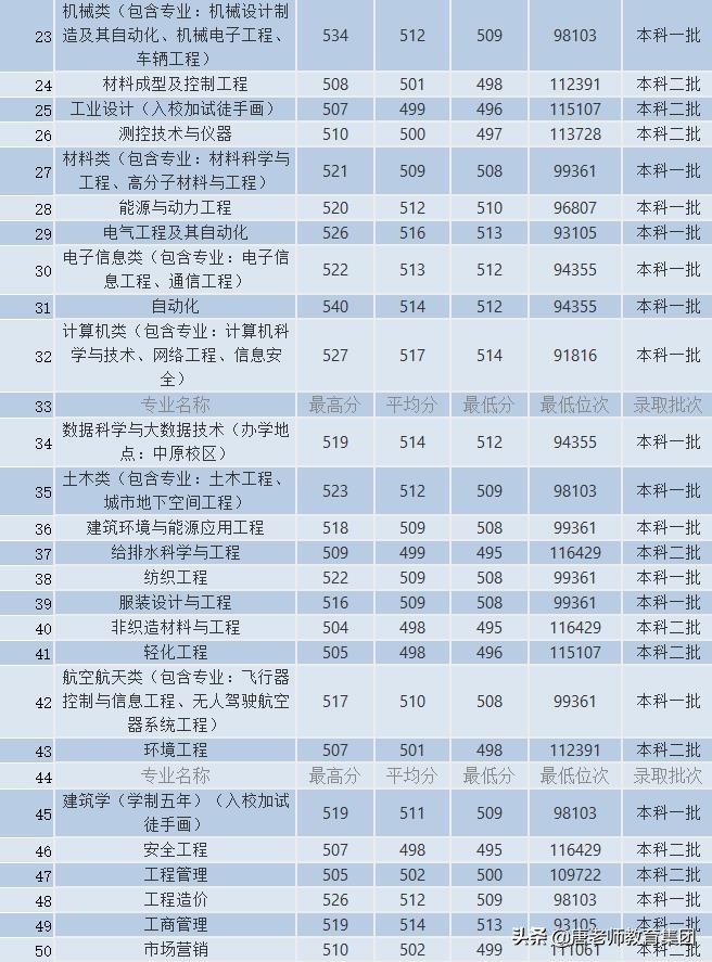 中原工学院历年各专业分数线一览表