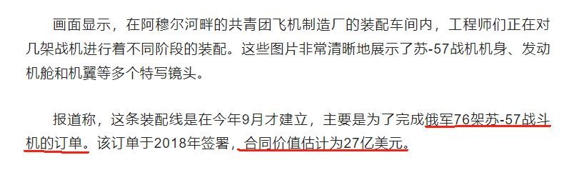 据报道,俄军和俄航空制造商签订苏57生产合约,76架苏57战机的合同价值27亿美元。