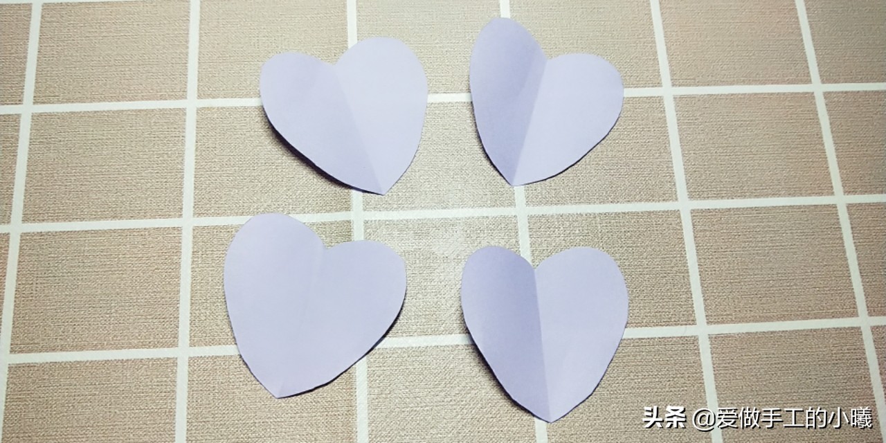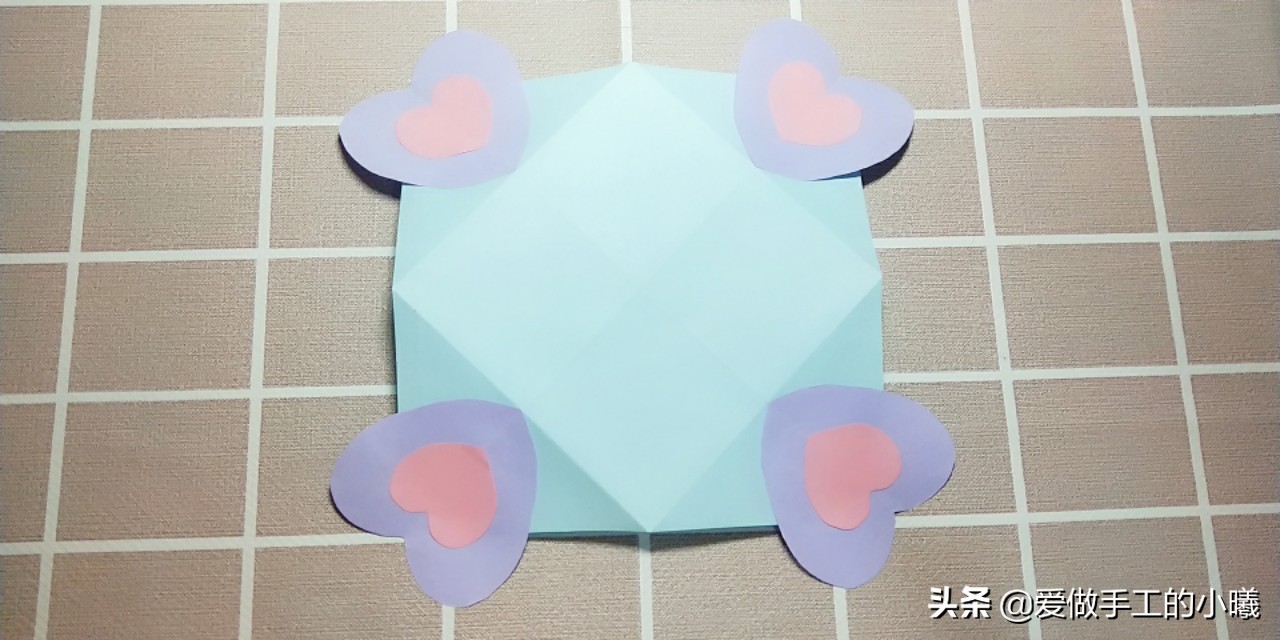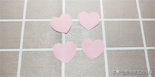 我们需要准备的材料有:一张正方形的纸,四个大一些的爱心,四个小一点的爱心,胶水。