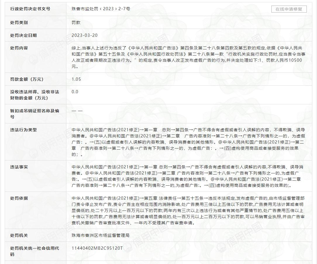 公告显示,珠海市香洲区市场监督管理局责令当事人改正发布虚假广告的行为,并决定处理罚款人民币10500元。