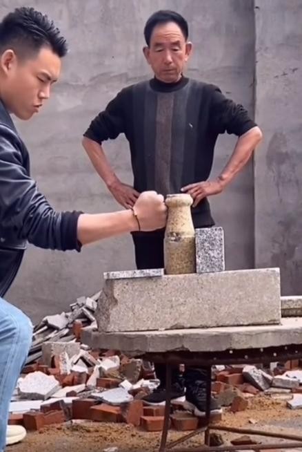 作为武林奇人,这个中国小伙的功夫早已到了炉火纯青的地步。寸拳击断花岩石,手掌拍断耐火砖,寸拳击断大理石,就连“隔山打牛”的功夫也十分精通,即使中间放上两块砖头,他也能利用一个核桃直接击碎砖后的酒瓶。