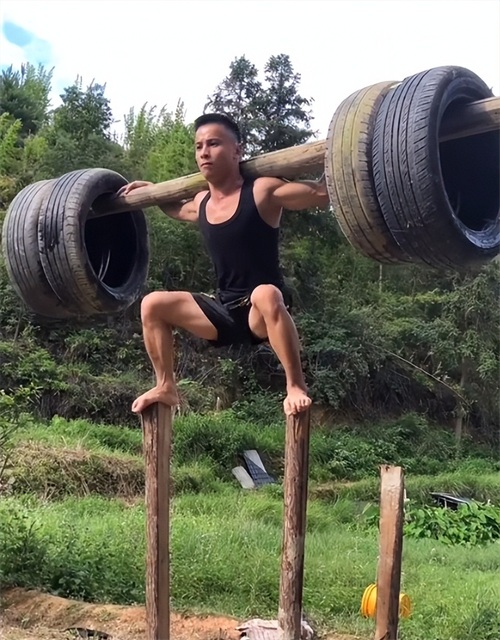 他训练的身影也经常穿梭着田间街头,只见他徒脚站在两根木头桩上,顶着四个大轮胎做着蹲起练习腿部力量。的确,所有中国功夫的背后都是需要付出汗水和努力的,只有吃得苦中苦,才方为人上人。