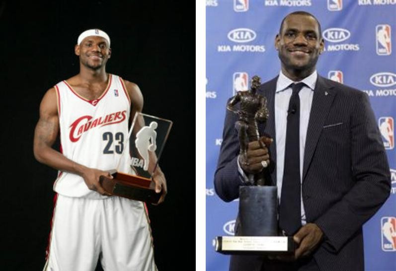 高中时期已经名声大噪的他,在2003年成为继科比后又一位以高中生身份登录NBA的球员,不同的是因为极其爆炸般的天赋,詹姆斯被克利夫兰骑士队以状元身份选中,自此开始了8年的骑士生涯,一如众多外界的期望,他轻松地打破了由科比保留的诸多最年轻的记录。在NBA生涯的第3年(2005-2006赛季)他开始出入锋芒,获得当年的全明星赛MVP,并带领骑士首次打进了季后赛,虽然在第二轮被活塞淘汰出局,但詹姆斯在季后赛取得场均30.8分、8.1个篮板及5.8个助攻。