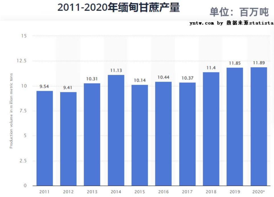 缅甸是东南亚中南半岛上最大的国家,面积约67万平方千米,人口超过5000万。缅甸的气候主要是热带季风气候和北部山区的高山、高原气候。农业为国民经济基础,可耕地面积约1800万公顷,尚有400多万公顷的空闲地待开发,农业产值占国民生产总值的四成左右,缅甸的主要经济作物有:水稻、棉花、黄麻、橡胶、甘蔗【图11】、烟草、咖啡等。