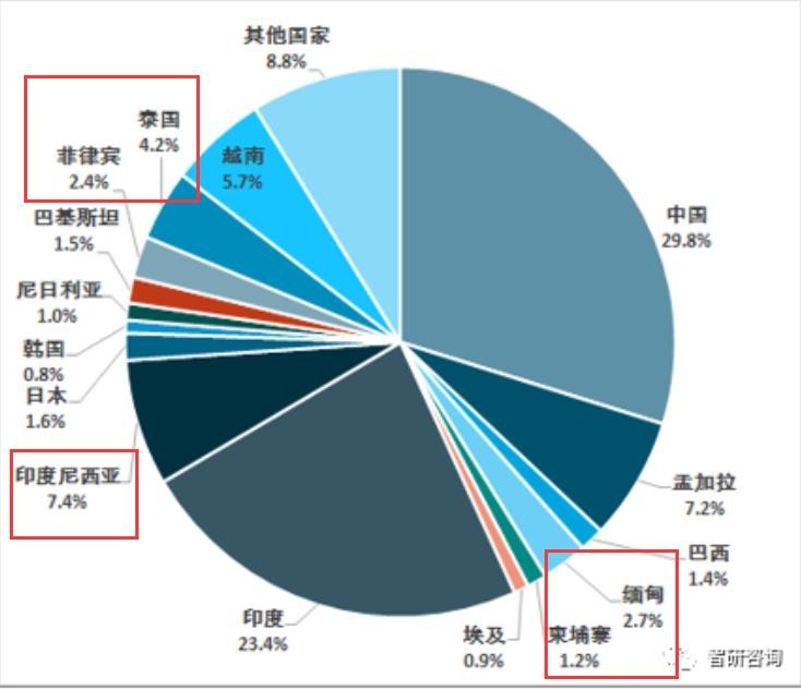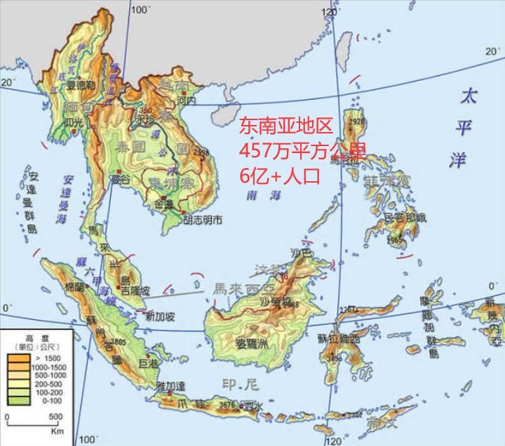 东南亚地区面积约457万平方公里【图5】,人口规模超过6亿。东南亚地区的国家【图6】有:中南半岛(缅甸、泰国、老挝、柬埔寨、越南)、马来半岛(马来西亚、新加坡)、马来(印尼)群岛(印度尼西亚、文莱、东帝汶)、菲律宾群岛(菲律宾)。