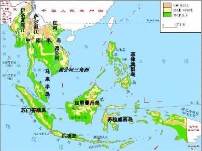 东南亚的地形【图2】:中南半岛主要是北部的山地、丘陵;南部的河流冲积三角洲等,如位于越南北部的红河三角洲、南部的湄公河三角洲等。马来(印尼)群岛、菲律宾群岛、马来半岛等地区,主要是中部山脉(火山居多)、沿海平原(面积较小)。