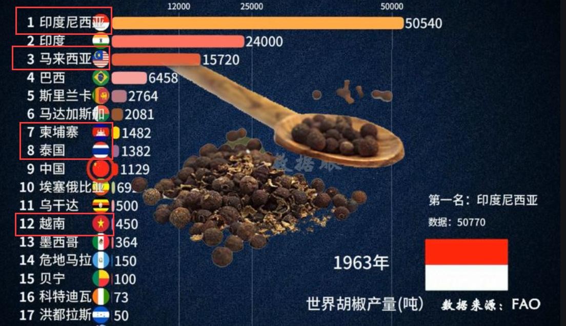 越南目前是东南亚第二大农产品出口国,经济作物有天然橡胶、黄麻、甘蔗、咖啡【图14~图15】、茶、烟叶、胡椒等,其中腰果、胡椒、咖啡、大米等商品出口在全球排名前列。越南是全球第三大木薯和木薯制品出口国,出口量仅次于泰国和柬埔寨,出口额位居全球第二仅次于泰国。中国是越南最大的木薯、荔枝等出口的第一大市场。越南是世界最大的胡椒【图16】生产和出口国,2022年,越南胡椒出口量约达22万吨,占全球胡椒总产量的55%。同时,第三大腰果生产国【图17~图18】、越南是世界第三大稻米出口国【图19~图21】、第二大咖啡豆生产国等。