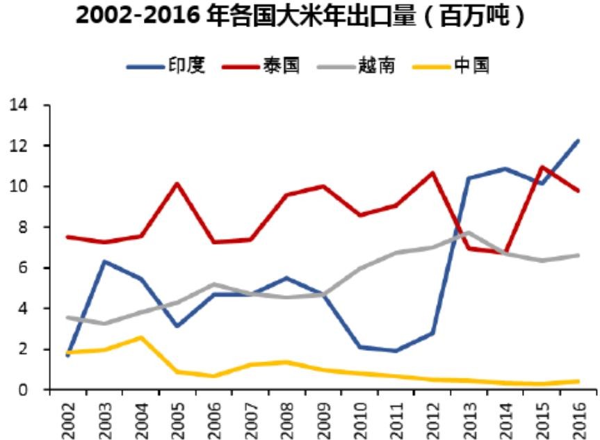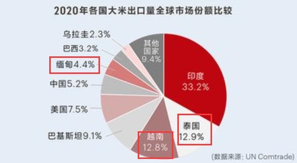 在二战以前,缅甸是世界上最大的稻米出口国。随着南亚、东南亚、东亚等国在稻米方面的发展,目前,缅甸的稻米出口份额约占世界的4%【图12~图13】,出口超百万吨,位列世界稻米出口前列。
