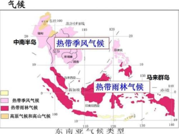 东南亚的气候【图3】:中南半岛北部(我国云贵高原南部延伸)部分地区是高原高山气候;中南半岛大部分地区和菲律宾群岛中北部地区是热带季风气候;马来半岛和马来(印尼)群岛大部分地区是热带雨林气候;马来(印尼)群岛东南部地区是热带稀疏草原气候。