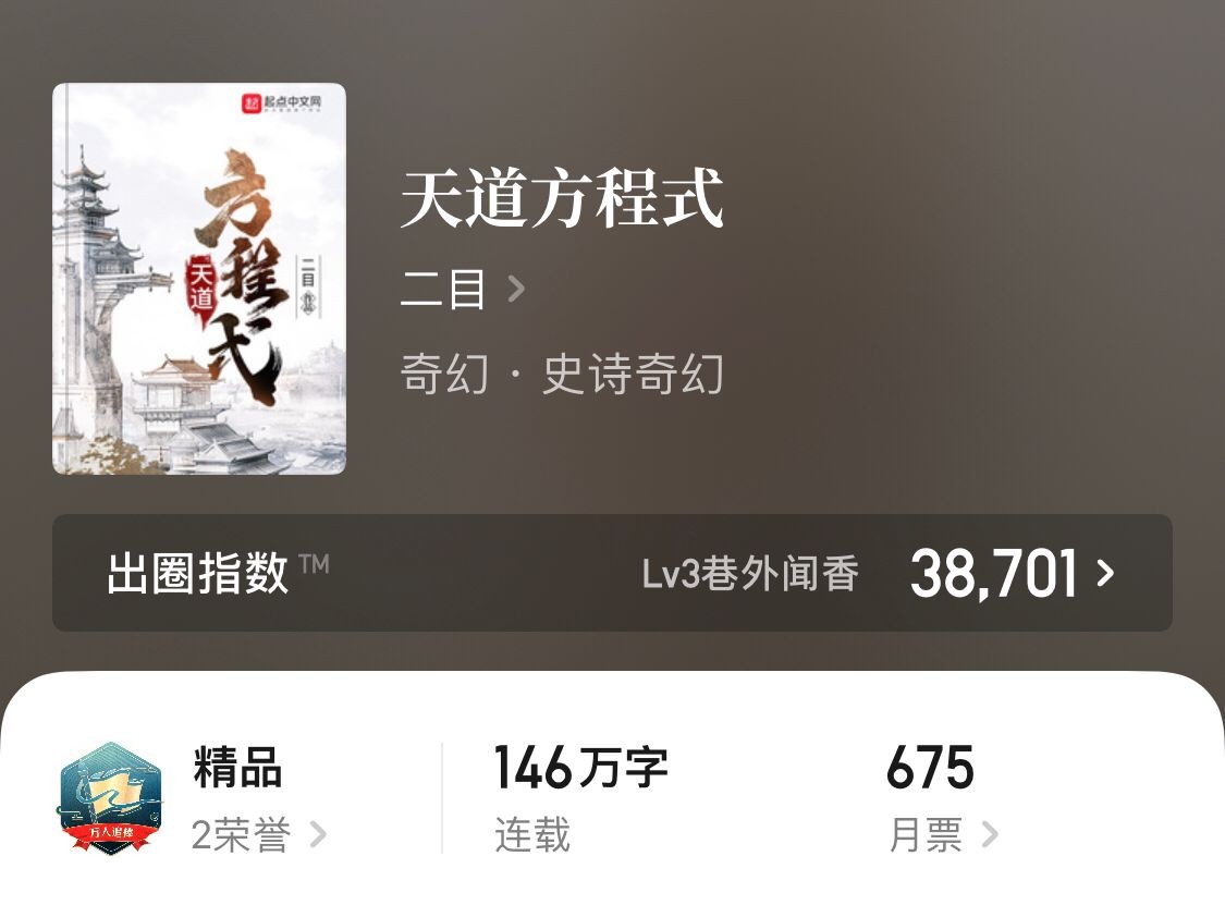 除了以上的几本西幻种田文之外,由大神二目所著的连载书《天道方程式》,目前也有100多万字了,比较肥了。
