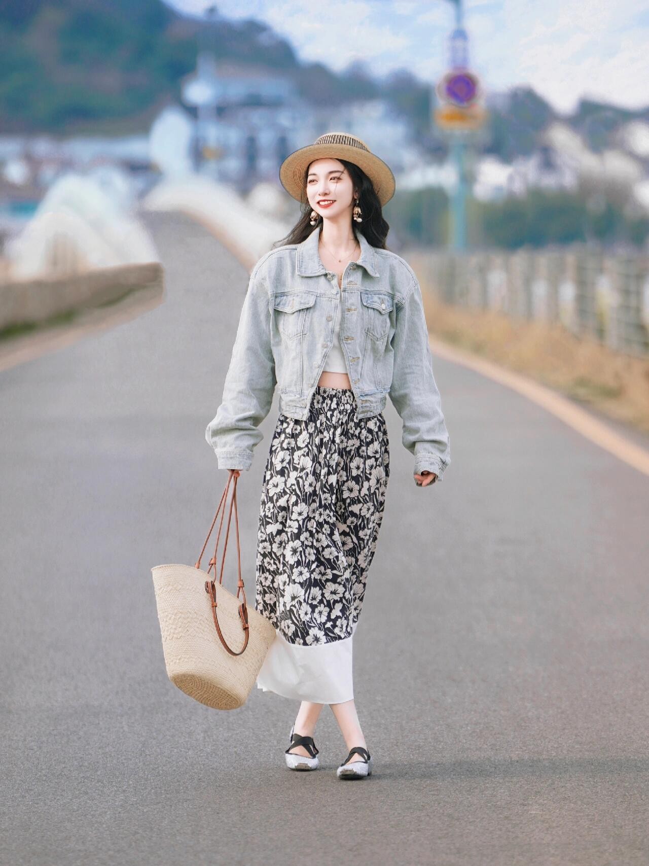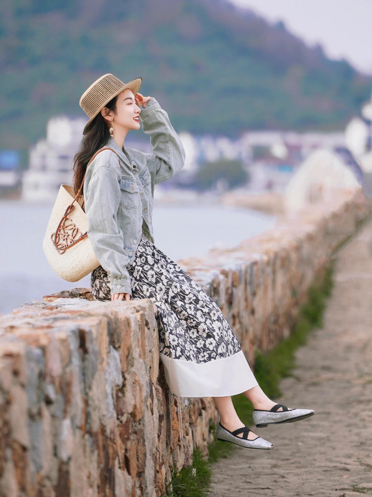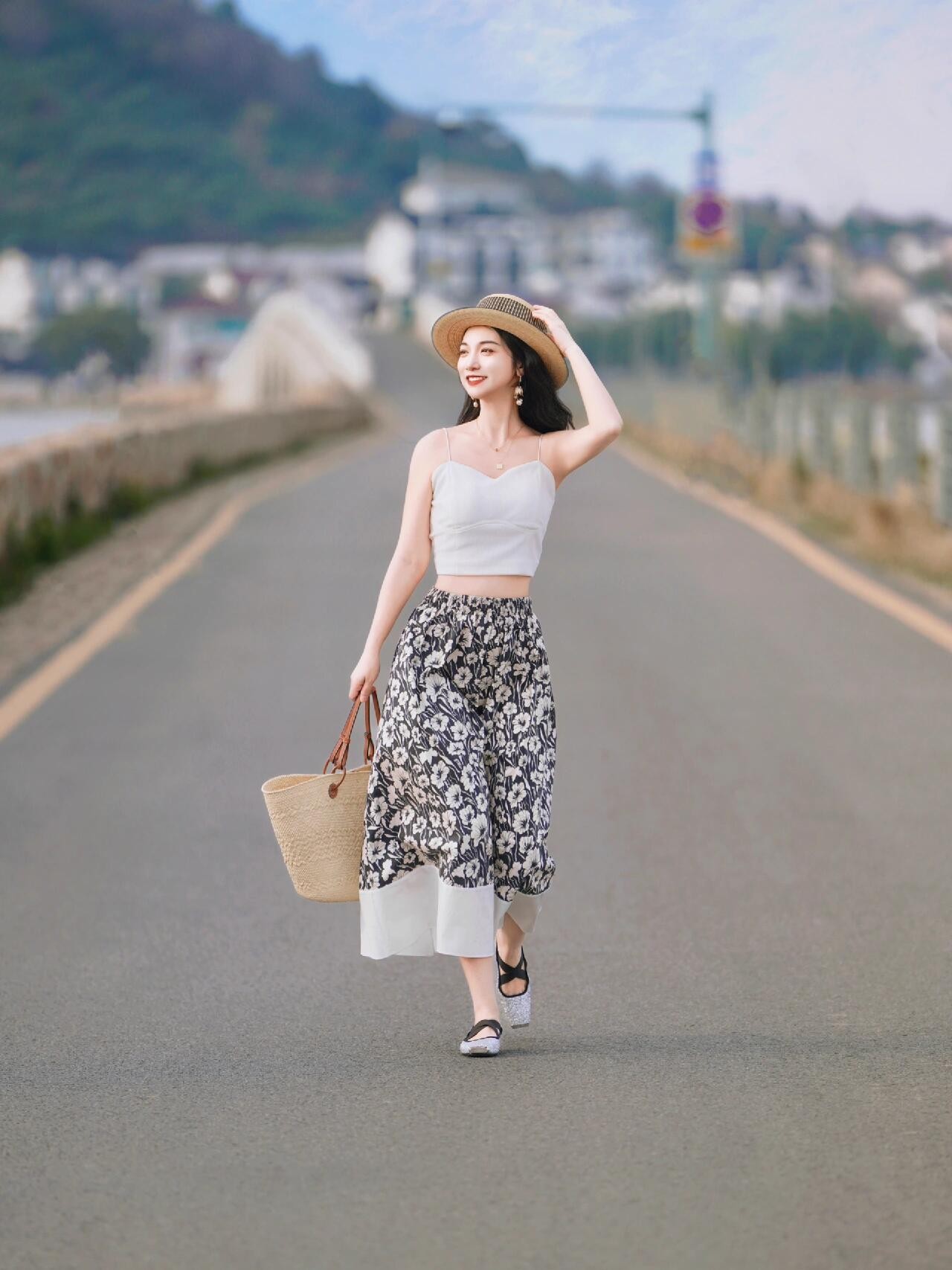 行走在海边的小道上,不看镜头的姿势往往更出片,学下面的模特一般,一手拎着包包,另外一手轻轻撑着帽檐,边走边眺望远处的海边美景,动感十足的姿势,自然生动且富含生活气息,随手一拍都很美。