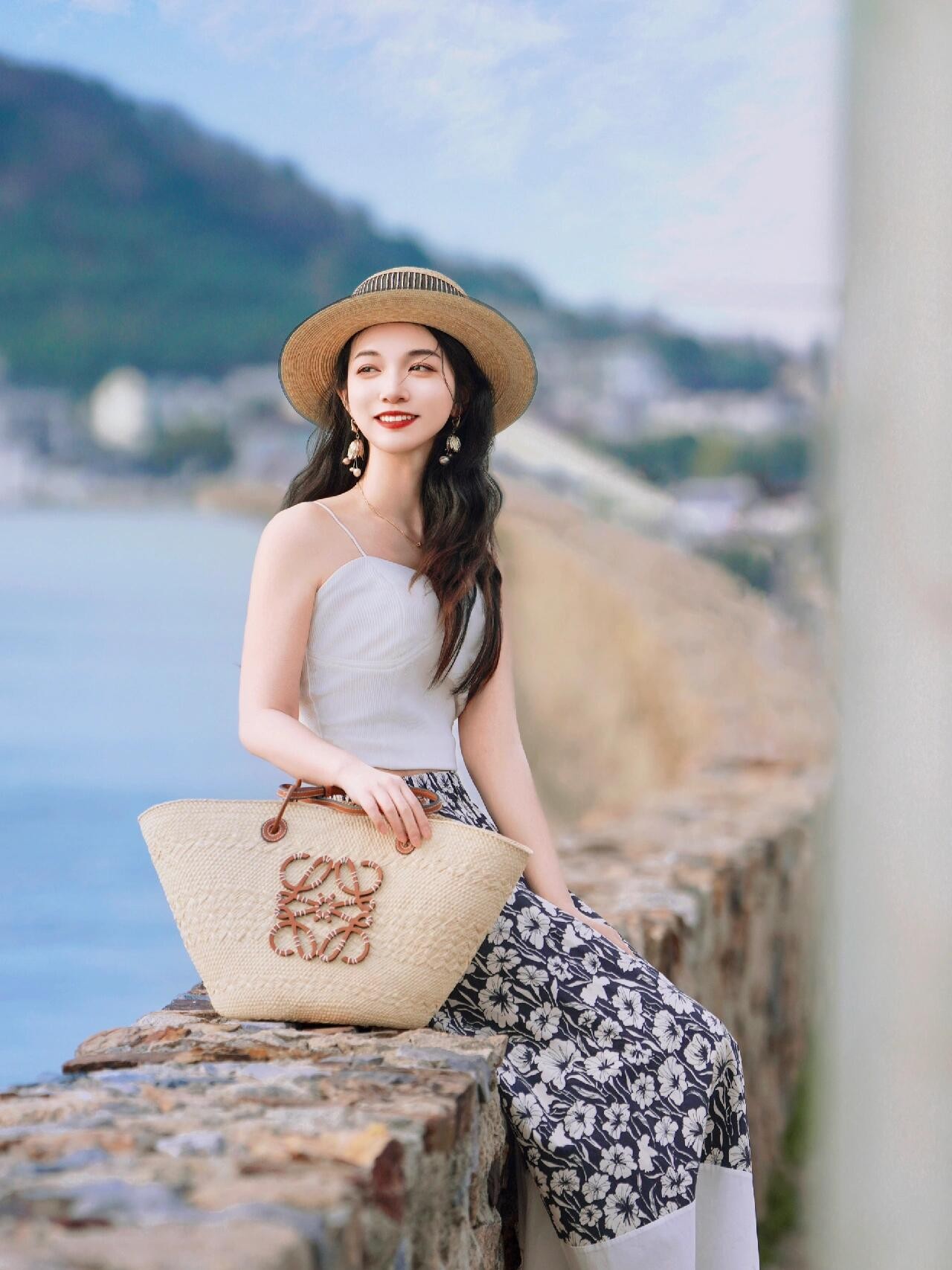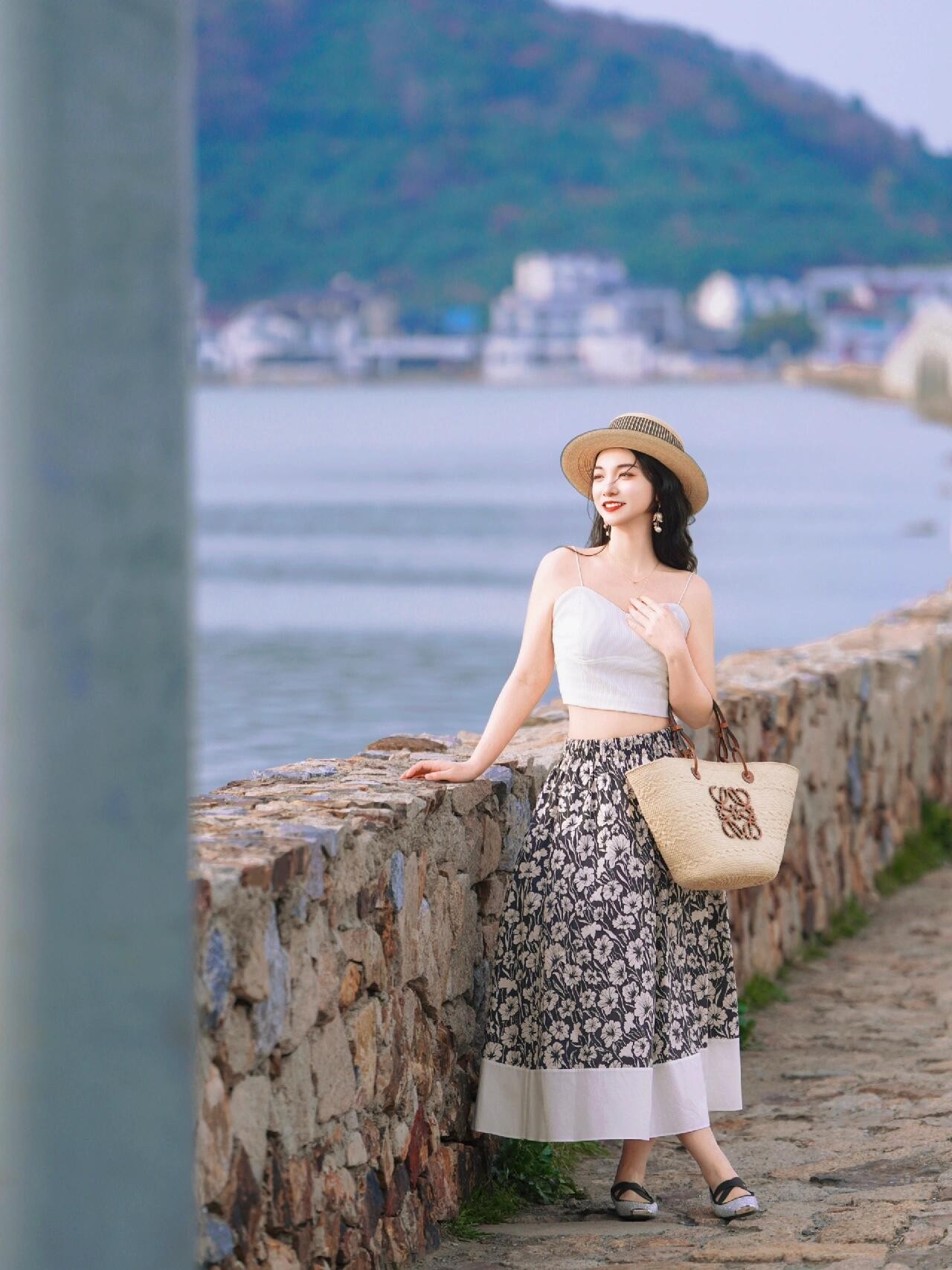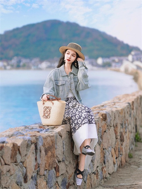 海边的石栏是帮助模特放松下来的有效道具,选择在风景优美的海边石栏拍照,让模特轻轻坐在上面,保持侧身对镜头,然后一手自然放在耳后,另外一手放在包包上,这样的姿势,一来能展现侧脸轮廓,二来也能让模特更优雅、自然,记得不看镜头更出片。