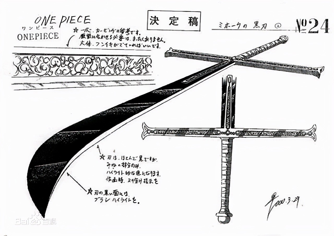 黑刀秋水:原持有者为和之国斩龙英雄龙马、后持有者为索隆、现持有者为光月日和。秋水伴随霜月龙马一生征战,未尝败绩,剑身通体黑色,为和之国国宝。