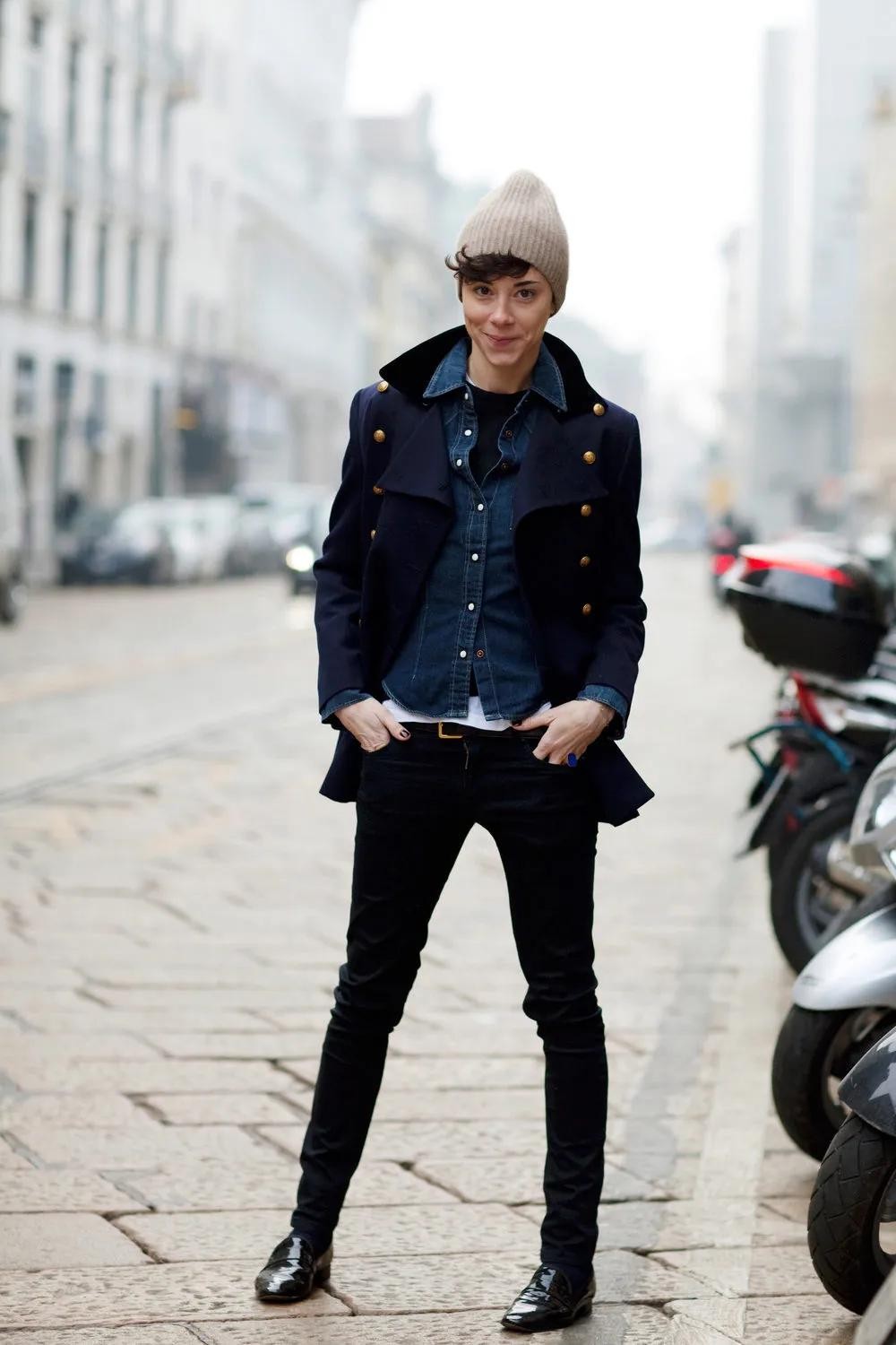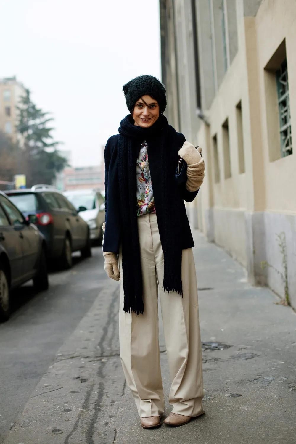 选择针织帽的时候如果想要清爽且收缩的视觉感,建议大家还是选择黑色深灰色,这样在视觉上也会有一点“缩头”的效果,而切记针织帽的形状不要软踏踏的从头顶掉下来,最好挺括一些,这样有型又修饰头型。