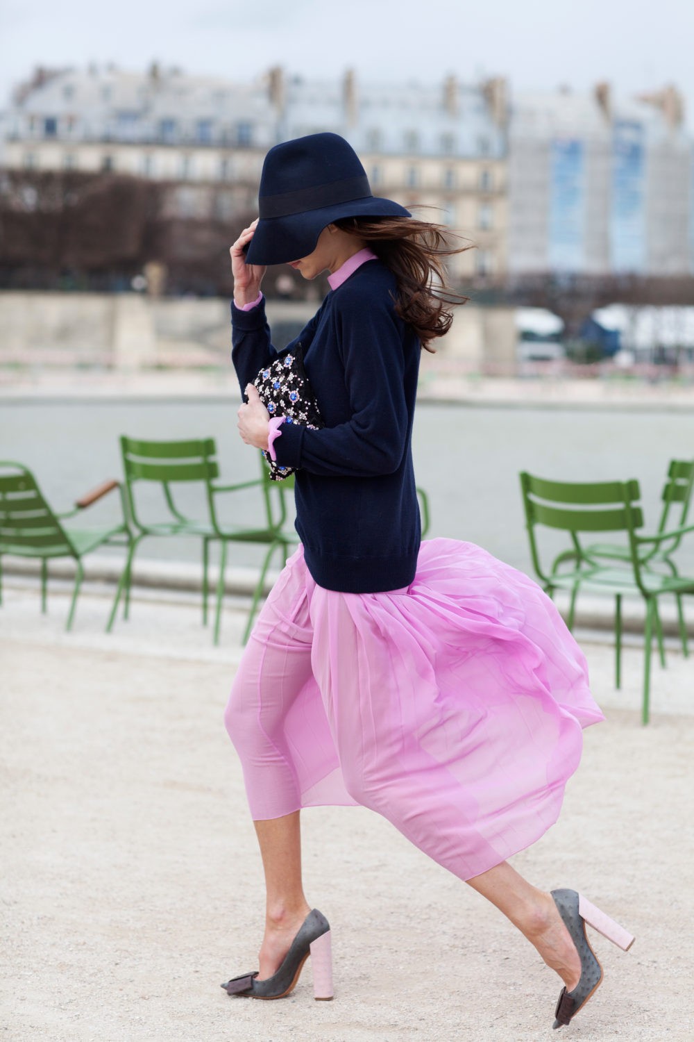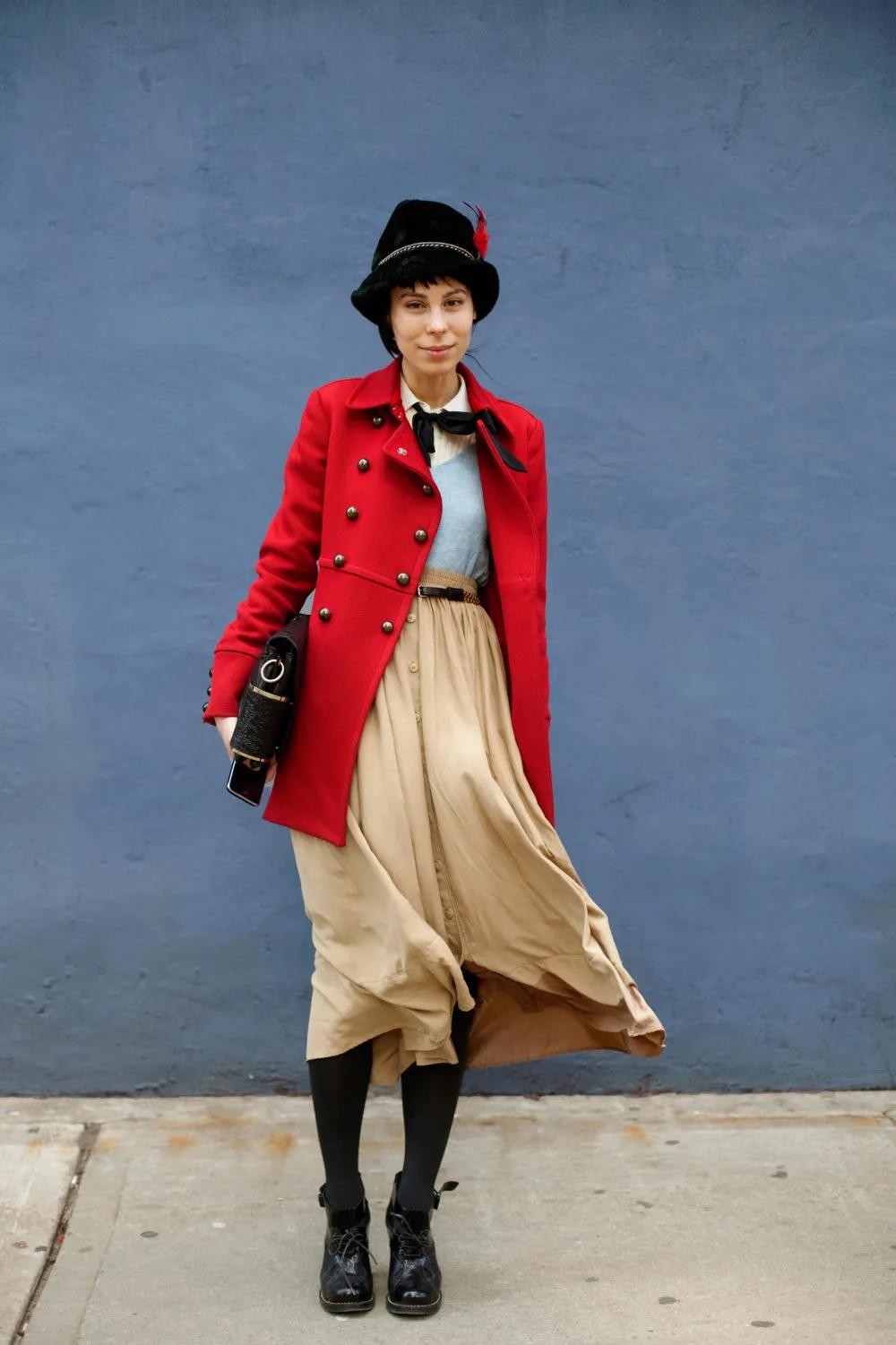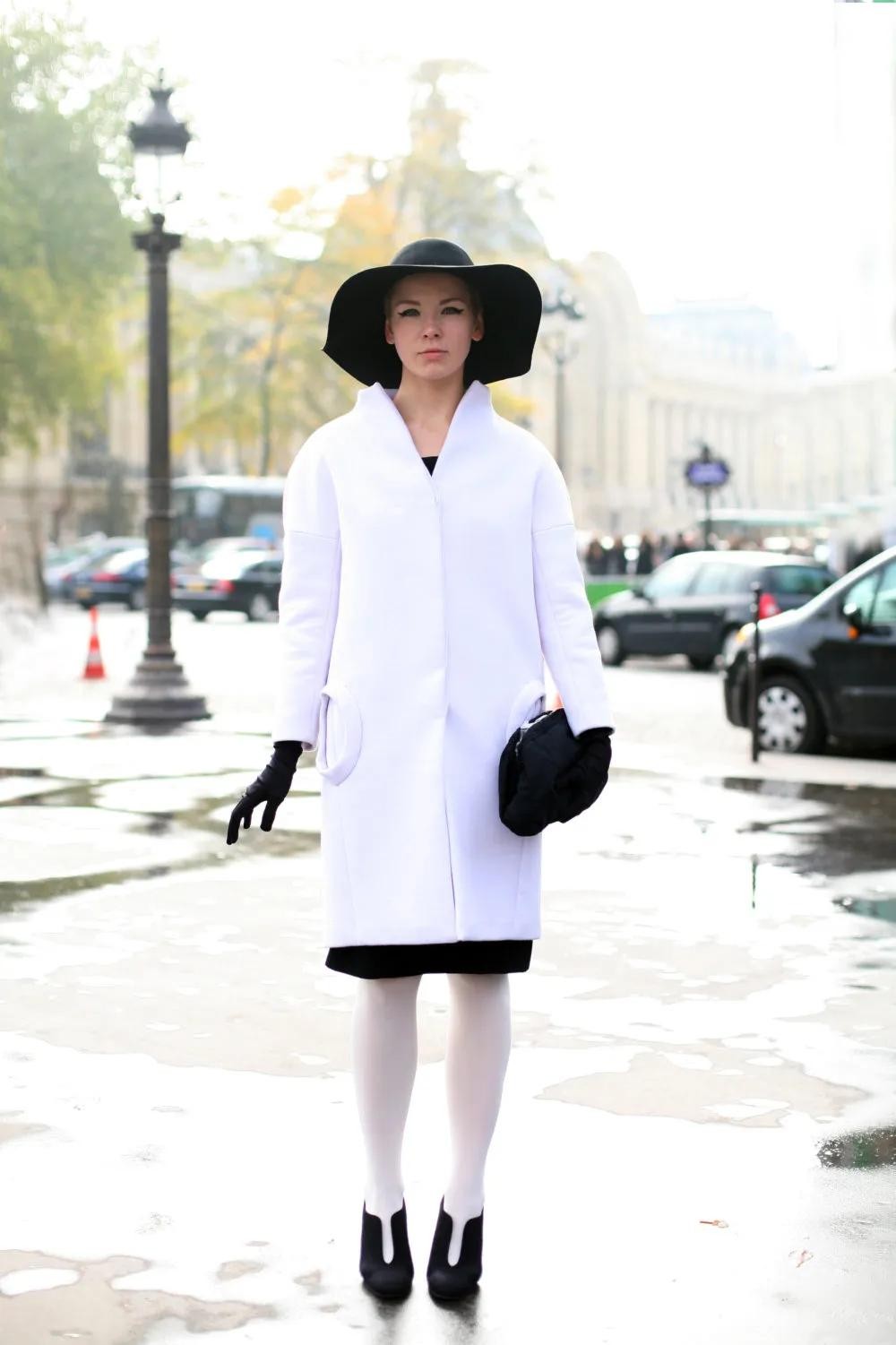 而相较宽帽檐的礼帽,更有深度的宽檐礼帽,大家也可以来做参考,花盆帽和宽檐帽的形状组合,可以让脸部被藏在帽子中的面积增多,露出的脸部肌肤就会变的更少,神秘又显脸小。
