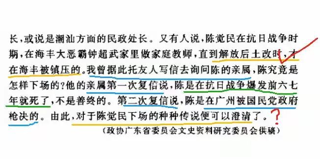 2,有人说陈觉民在抗日战争时做了汉奸,是广东省民政厅长,或说是潮汕方面的民政处长。又有人说,陈觉民在抗日战争时期,在海丰大恶霸钟超武家里做教师,直到解放后土改时,才在海丰被镇压的。我曾据此托友人写信去询问陈的亲属,陈究竟是怎样下场的?他的亲属第一次复信说,陈是在抗日战争爆发前六七年就死了,不是善终的。第二次复信说,陈是在广州被国民党政府枪决的。由此,对于陈觉民下场的种种传说便可以澄清了。】