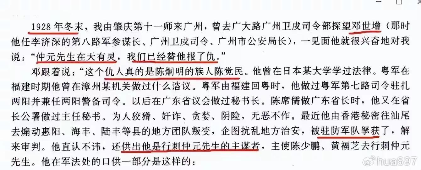 邓世增当时向我转述了陈觉民罪犯这些口供以后,并说:“陈虽没有供出仲元先生解散了他的粤军第七路部队,因而怀恨在心,引起杀机。但在我看来他之所以要主谋暗杀仲元先生,这必然是最主要的原因。”我便问邓现在对陈觉民打算怎样处理?他说已于十多天前把陈枪决了。我说在报纸上没有看到这个新闻。他说已出了布告宣布陈觉民煽动地方团队叛变图谋不轨的罪状,然后把他执行枪决的。希望将来还可以拿到陈少鹏,黄福芝等来正法,所以不说他行刺仲元先生的事。此后邓世增对本案还对我说过一二次,加上我平日对邓仲元先生的景仰,所以对此印象很是深刻,不会磨灭。我相信其他好些听过邓世增说这段话的人都能记忆,可作见证。