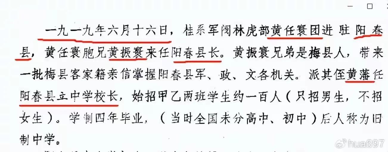 【图24,《阳春文史资料 1982年》“阳春学校教育简史” 第5页:一九一九年六月十六日,桂系军阀林虎部黄任寰团进驻阳春县,黄任寰胞兄黄振寰来任阳春县长。(华697注:黄振寰去到阳春后,对阳春西山“匪患横行”极度不满,先就是枪毙了“剿匪不力”的前阳春县长陈巽,再对“通匪”的群众使用雷霆手段:A,凡是土匪家属一律入罪,财产充公;B,“通匪者”,“资匪者”一律与土匪同罪。其措施的直接后果就是:西山人不通匪就挨土匪杀,通匪又挨官兵杀;所以他们不是远走他乡,就是直接进山为匪。不是吗?反正都是“同罪”。一时间,西山的土匪多到官兵根本就没法剿灭的地步。1920年10月25日,黄任寰被调去了防守东江,陈铭枢,陈济棠他们又宣布独立。大量的西山土匪攻陷了阳春县城,将黄振寰一伙杀了个鸡犬不留;这就是李洁之号称的“阳春惨案”。其实在阳春是没有多少人同情他们的,说他们是另一帮土匪。)】
