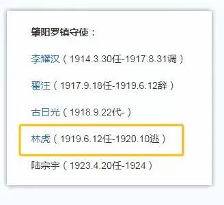【图22,《广东文史资料 第43辑 广东军阀大事记》:1919年,六月十二日,桂系林虎接任肇阳罗镇守使,受令率兵入肇庆,改编驻肇军队。】