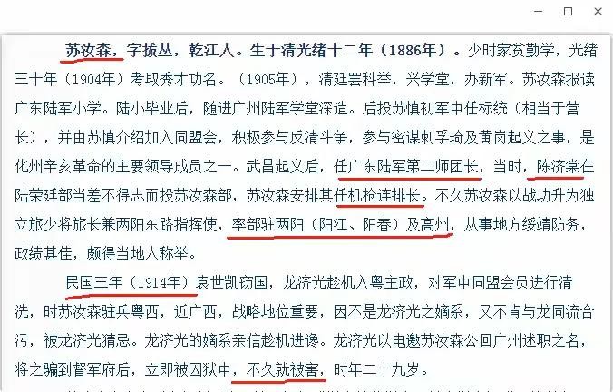 【图20,网络搜索“苏汝森”资料:苏汝森,字拔丛,乾江人。生于清光绪十二年(1886年)。......武昌起义后,任广东陆军第二师团长,当时,陈济棠在陆荣廷部当差不得志而投苏汝森部,苏汝森安排其任机枪连排长。不久苏汝森以战功升为独立旅少将旅长兼两阳东路指挥使,率部驻两阳(阳江,阳春)及高州,从事地方绥靖防务,政绩甚佳,颇得当地人称举。