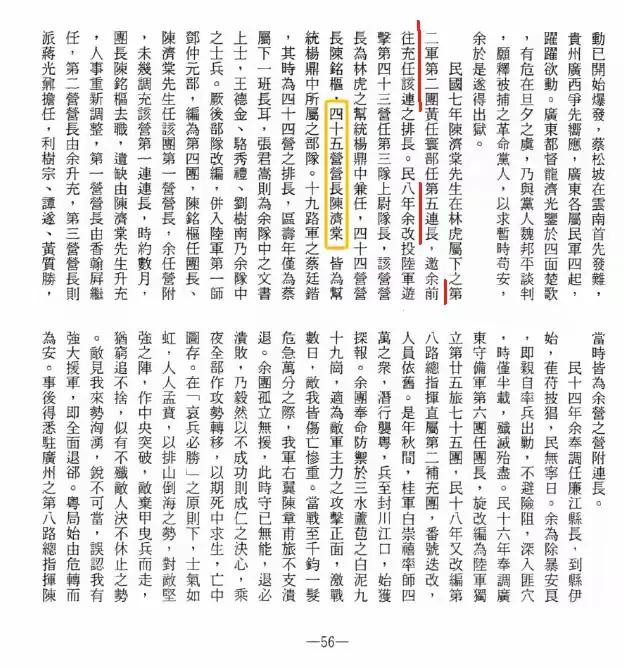 【图25,黄质文《须眉易色忆沧桑》:民国七年,陈济棠先生在林虎属下之第二军第二团黄任寰部任第五连连长,余前往充任该连之排长。民国八年余改投陆军游击第四十三营任第三队上尉队长,该营营长为林虎之帮统杨鼎中兼任,四十四营营长陈铭枢,四十五营营长为陈济棠,皆为帮统杨鼎中所属之部队。】
