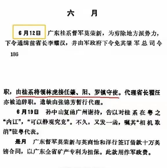 【图23,《广州百年大事记》186页:1919年,6月12日,广东桂系督军莫荣新,为剪除地方派势力,下令通缉前省长李耀汉,并由军政府下令免其肇军总司令职,又桂系将领林虎接任肇,阳,罗镇守使。】
