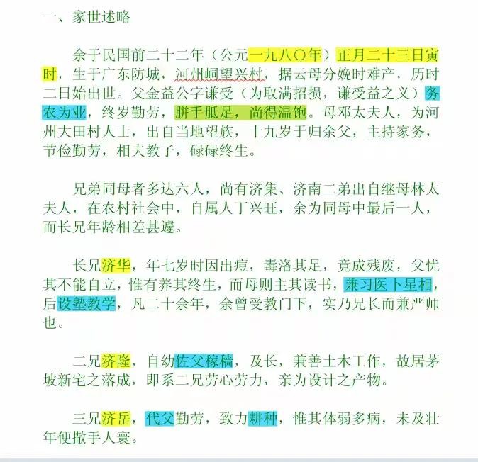 陈济棠在《自传稿》讲述的家庭情况