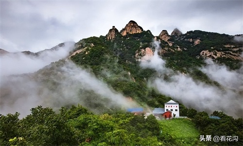32.镇平县的著名景点-五垛山风景区。五垛山位于二龙乡北部,因其有五峰对峙而得名。有祖师庙、青牛宫、大潭、二潭、三潭等10处景点。属伏牛山在镇平境内的余脉,总面积58平方公里,其主峰圣垛(亦称北顶)海拔1665米,似一柱擎天,直插云霄。站在山腰的青牛宫遥望垛顶的祖师庙,整座庙宇悬在半空云雾中,若隐若现 似空中楼阁,别有一番风味。北顶祖师庙始建于唐初,由著名道士吴筠创建,称“ 吴筠观”。“北顶祖师庙”距今已有一千多年的历史。千百年来,北顶祖师庙已成为湖北、陕西、河南周边3省数百万香客朝圣的场所。